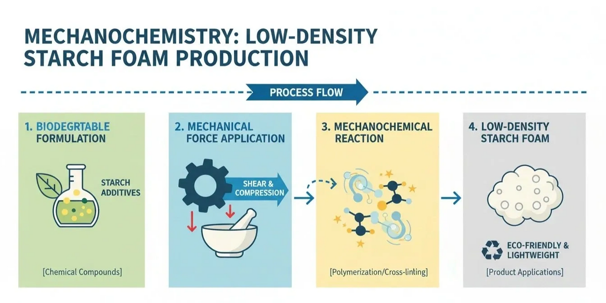 StarchTek uses mechanochemistry (the controlled application of mechanical energy, heat, and pressure) to transform renewable starch into high-performance protective packaging. Selected plant-based starches are processed in a specialized extrusion environment, where mechanical forces activate and convert the raw material into sheets, panels, and custom profiles.